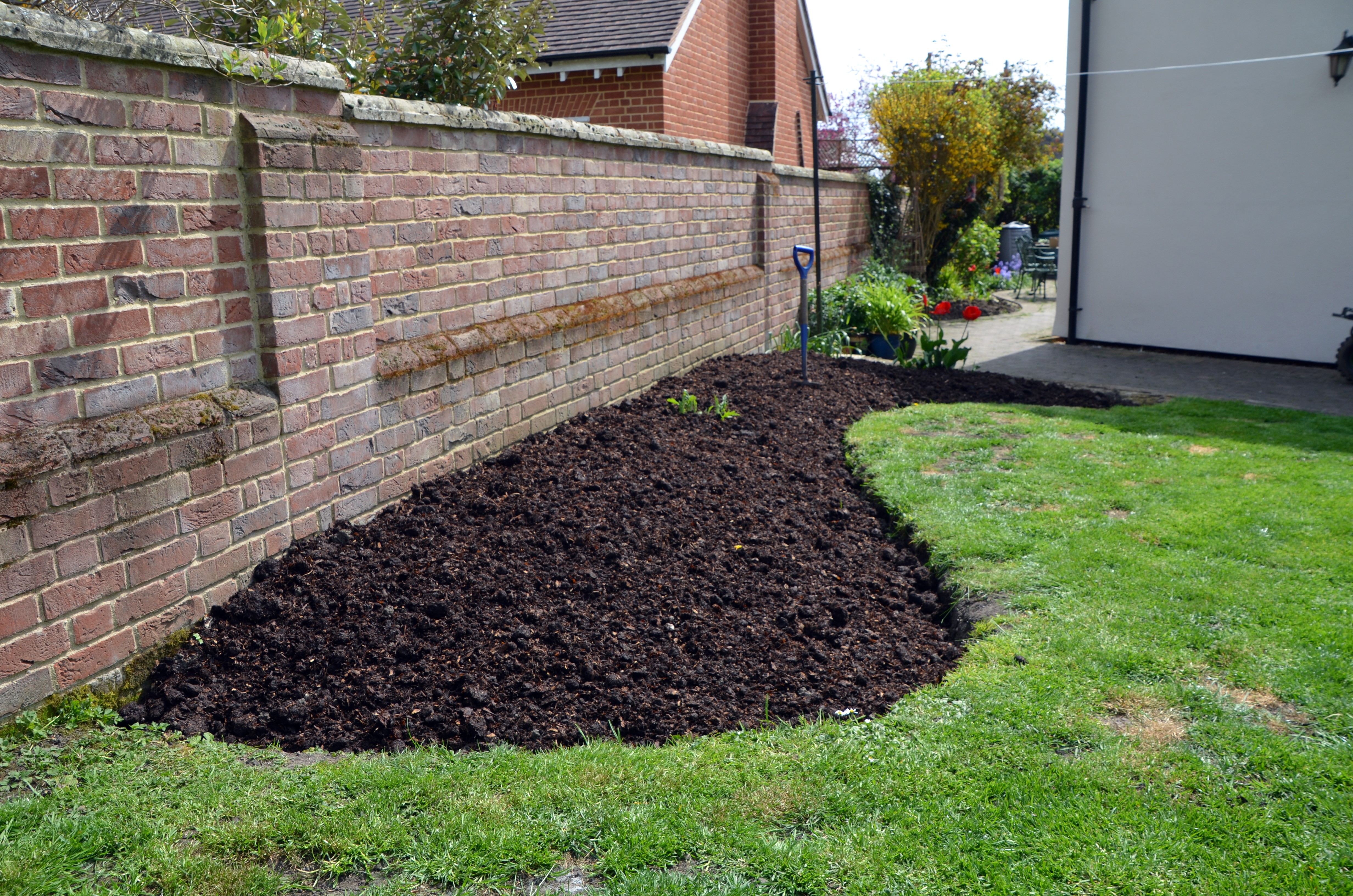 I replaced the timber like for like with some new pressure treated 8″ x 2″ about 2 weeks ago. Before doing so Janet and I weeded the existing soil and then heaped it up in the centre of the bed to allow the timber to be removed. The new timber was installed and then the old soil re-levelled. At this stage it was apparent that the soil was in desperate need of some organic matter.